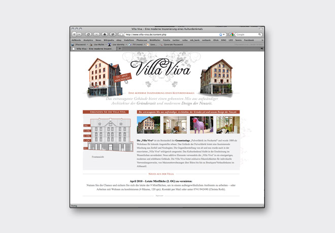 Die hochwertig sanierte Gründerzeitvilla bekommt durch die Online-Website eine ästhetisch ansprechende Charakteristik: Reduzierte Farbigkeit und eine sehr klassische Typografie erzeugen eine der Architektur angemessene Tonalität.