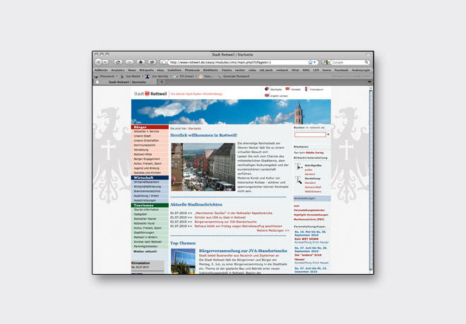 Für die Online-Adaption des visuellen Profils der Stadt Rottweil gestaltete ich mit meinem Kollegen Robert Hak das Screendesign der Stadtseite. Die Herausforderung war die Umsetzung von Workshopergebnissen der Stadtverwaltung, die wiederum Ausgangspunkt für die technische Umsetzung der Agentur Hitcom war.