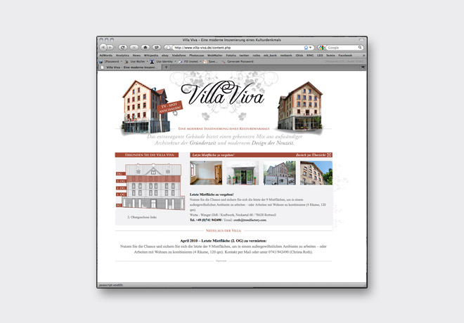 Die hochwertig sanierte Gründerzeitvilla bekommt durch die Online-Website eine ästhetisch ansprechende Charakteristik: Reduzierte Farbigkeit und eine sehr klassische Typografie erzeugen eine der Architektur angemessene Tonalität.